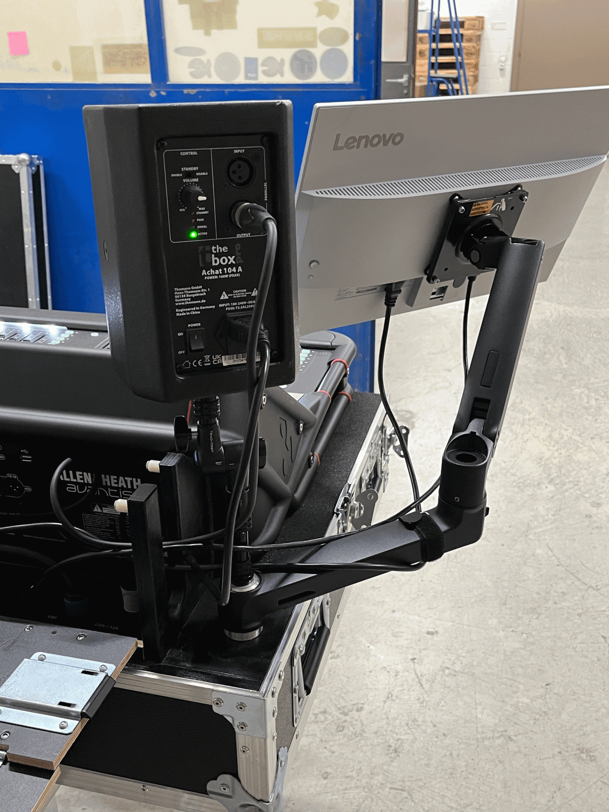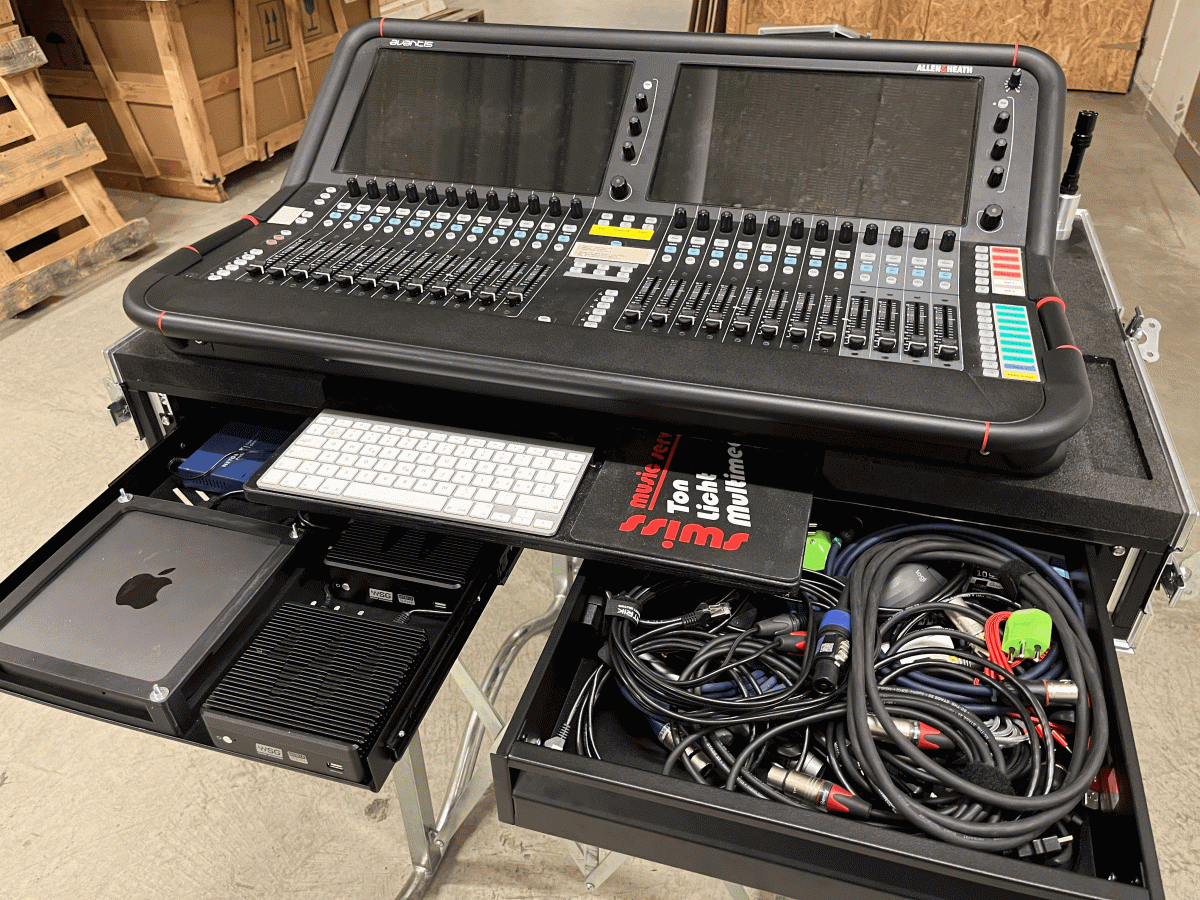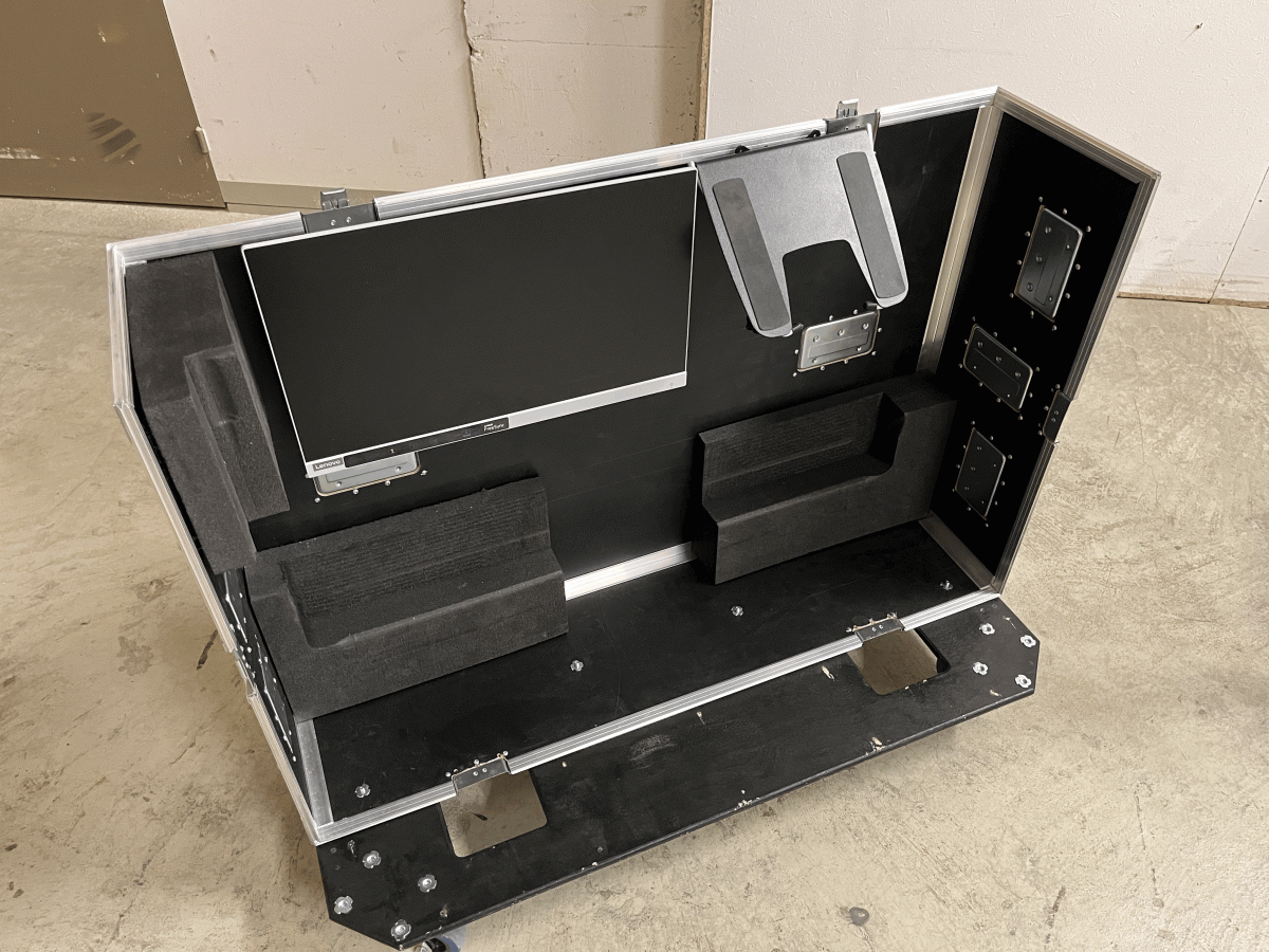 Unterkonstruktion wurde mit 15mm Multiplex gebaut. Auflager aus 30mm Plastazote mit Frässungen welche die Gummifüsse der Avantis aufnehmen und so ein Verrutschen verhindern. Schublade mit Apple-Tastatur und Mousepad. Unten 2 x 2HE für eine Rackschublade und eine Rackablage. Verbaut wurde ein MacMini als Hostcomputer und zwei Waves Mobile-Server. Im Doghaus zwei eigene Blenden gebaut für die diversen Verbindungen. Aluteile gedreht welche links und rechts zwei Ergotron-Arme für einen Screen und eine Labtopablage aufnehmen können. Oben jeweils Triad-Orbit Quicklook Adapter für ein Messmikrofon und einen kleinen aktiven Lautsprecher. Im Doghouse eine LED-Beleuchtung verbaut um auch in dunkler Umgebung verkabeln zu können. Auch die Rackschublade wird über einen LED-Streifen beleuchtet. Im Case ist auch ein Apple Airport Express verbaut