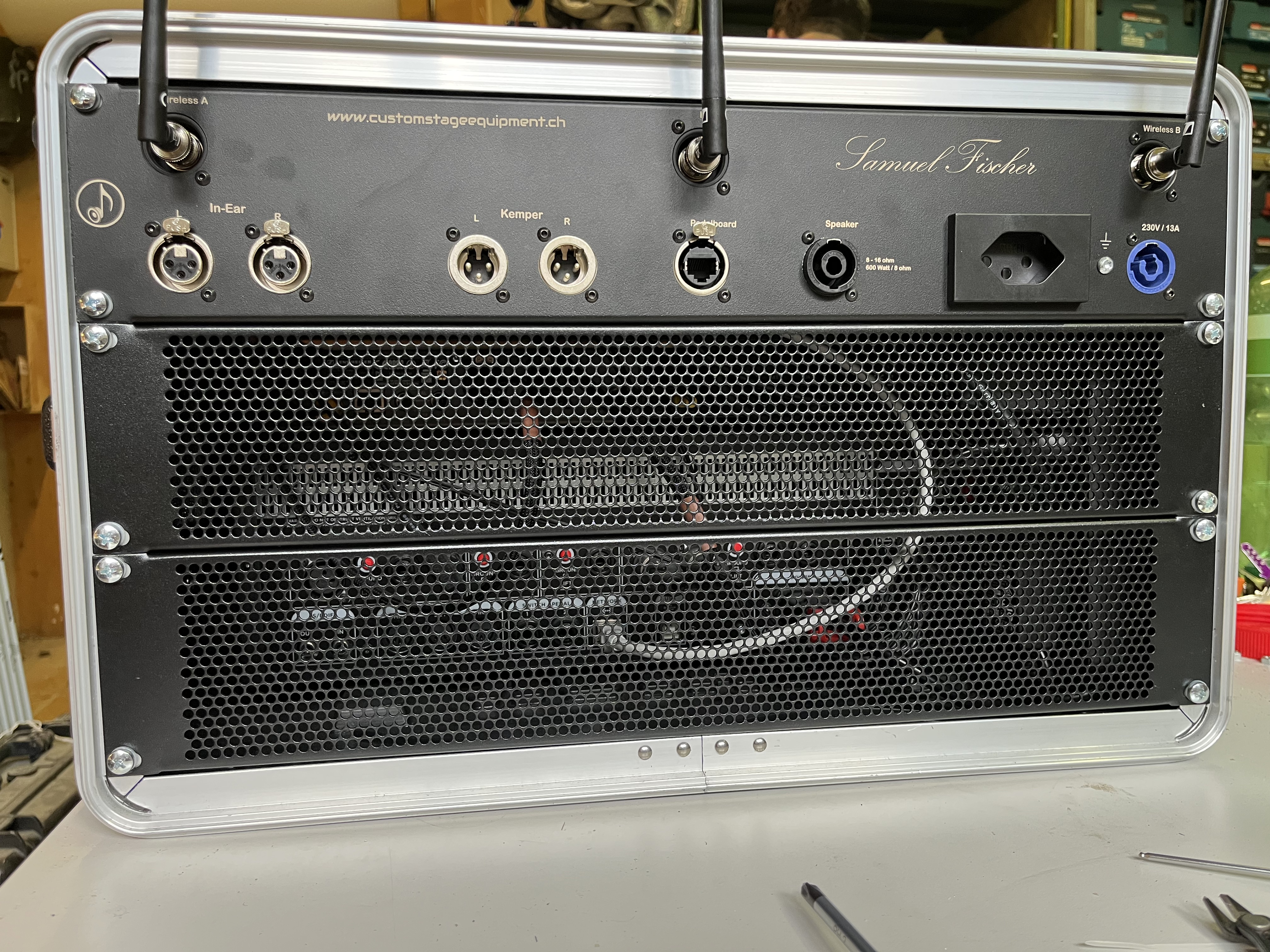 Für den Bassisten von Beyond Dystopia durften wir sein Bassrack komplett neu aufbauen und verkabeln. Wir planten und erstellen ein Inlay für die Rackschublade und eine Steckerblende für sömtliche Anschlüsse.