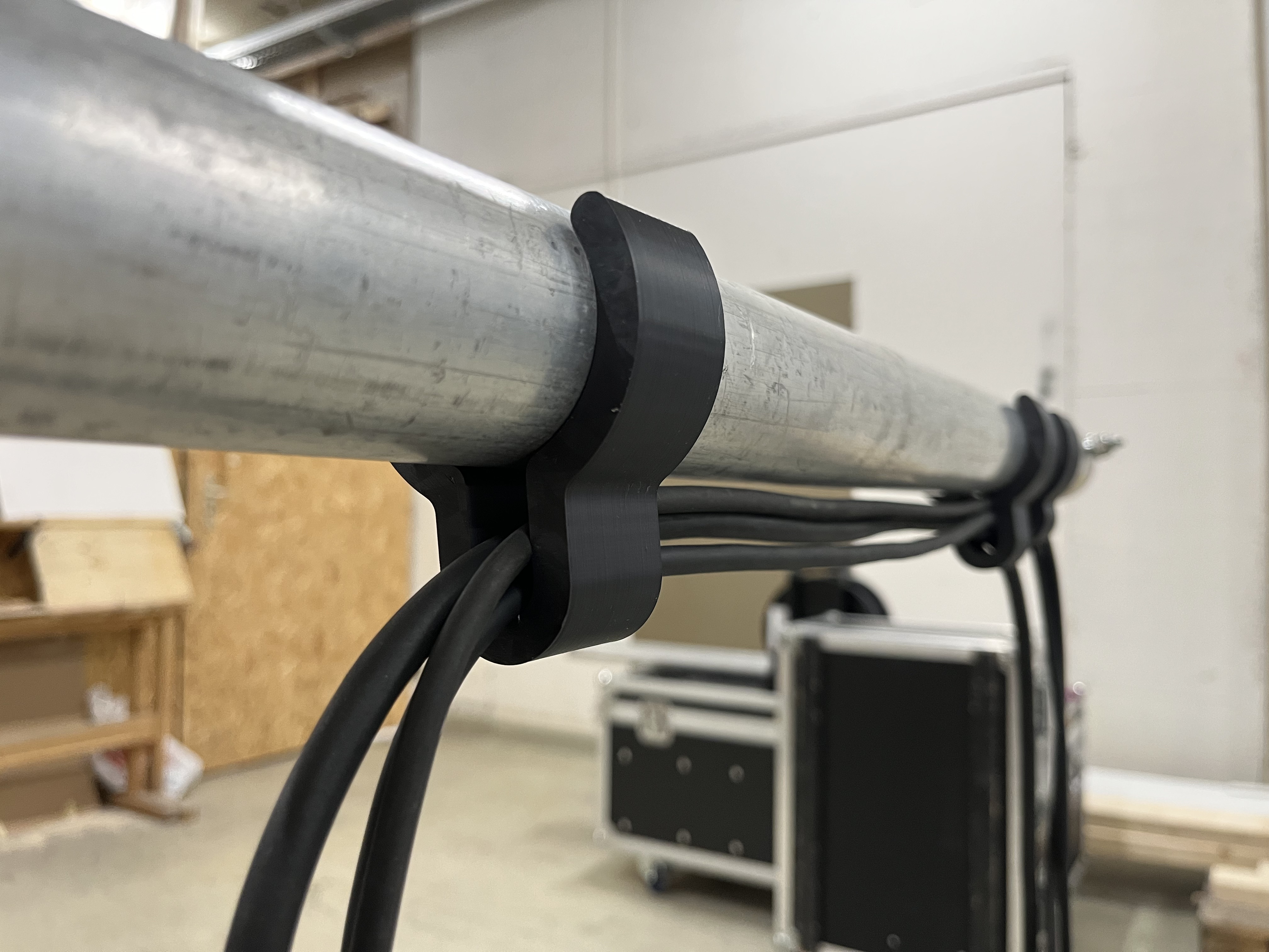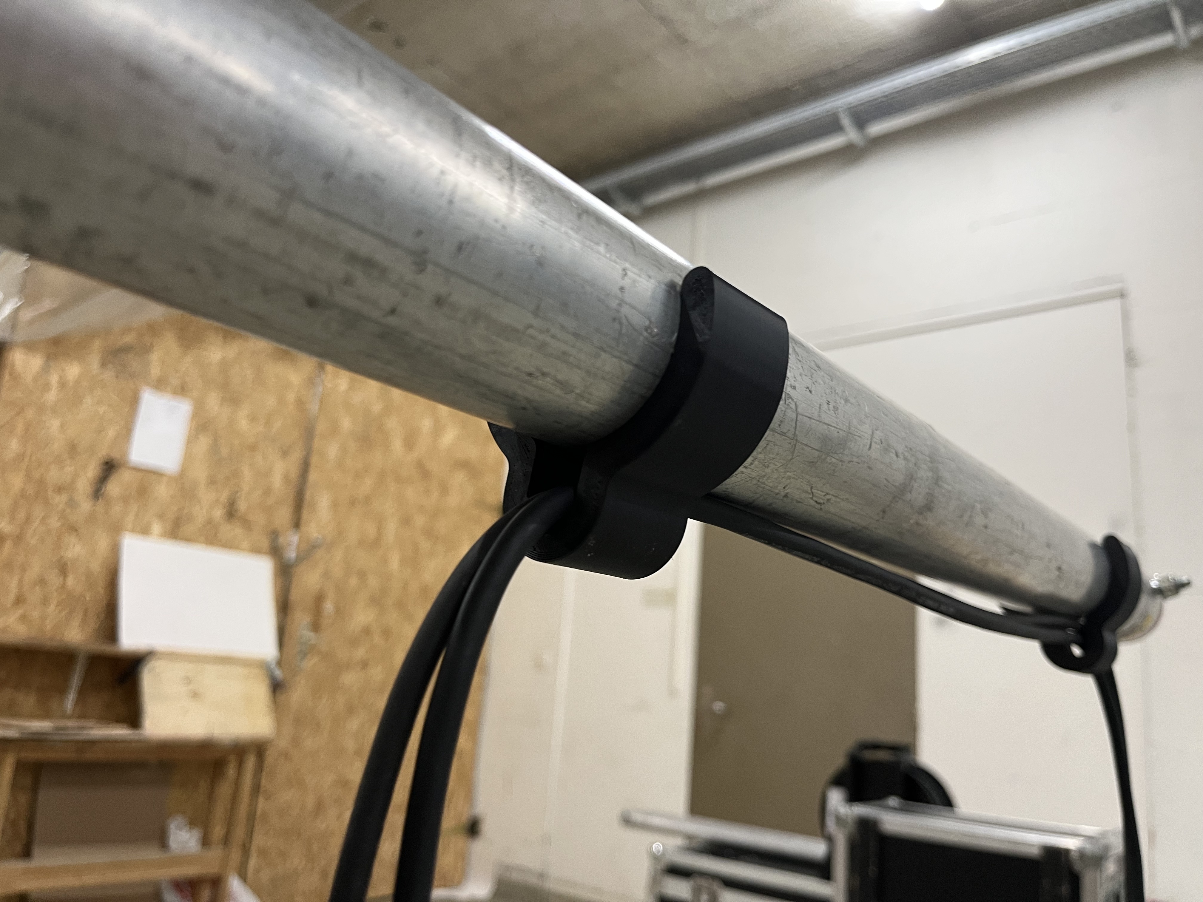 Vorbei sind die Zeiten mit Kabel durchs Truss fädeln, mit Isoband befetigen usw. Hier zwei Lösungsansätze für die Kabelführung in Trusskonstruktionen. Unten in zwei verschiedenen Grössen. Die Teile sind mit ASA-Filament gedruckt und somit enorm abrieb- und UV-Beständig.