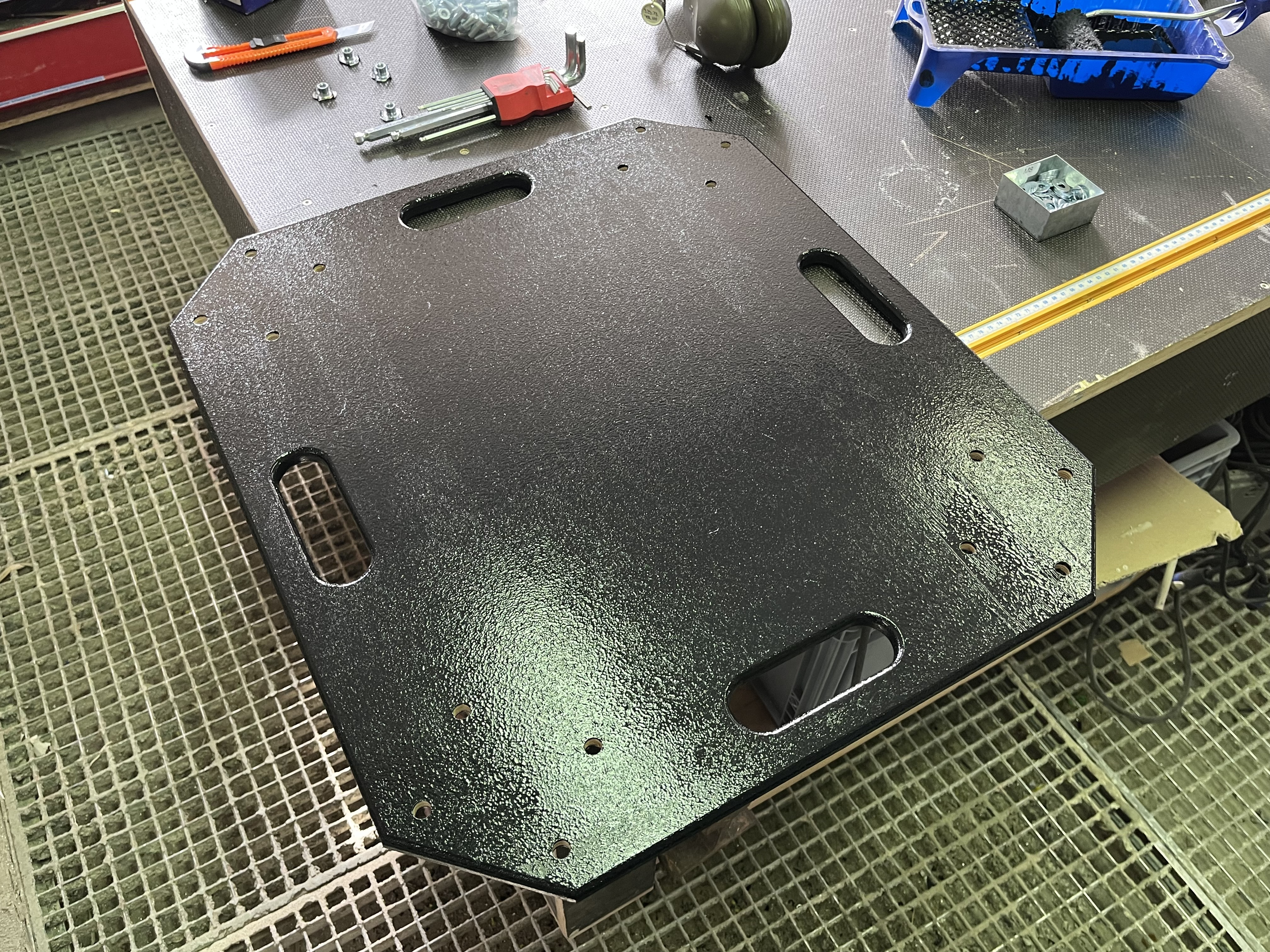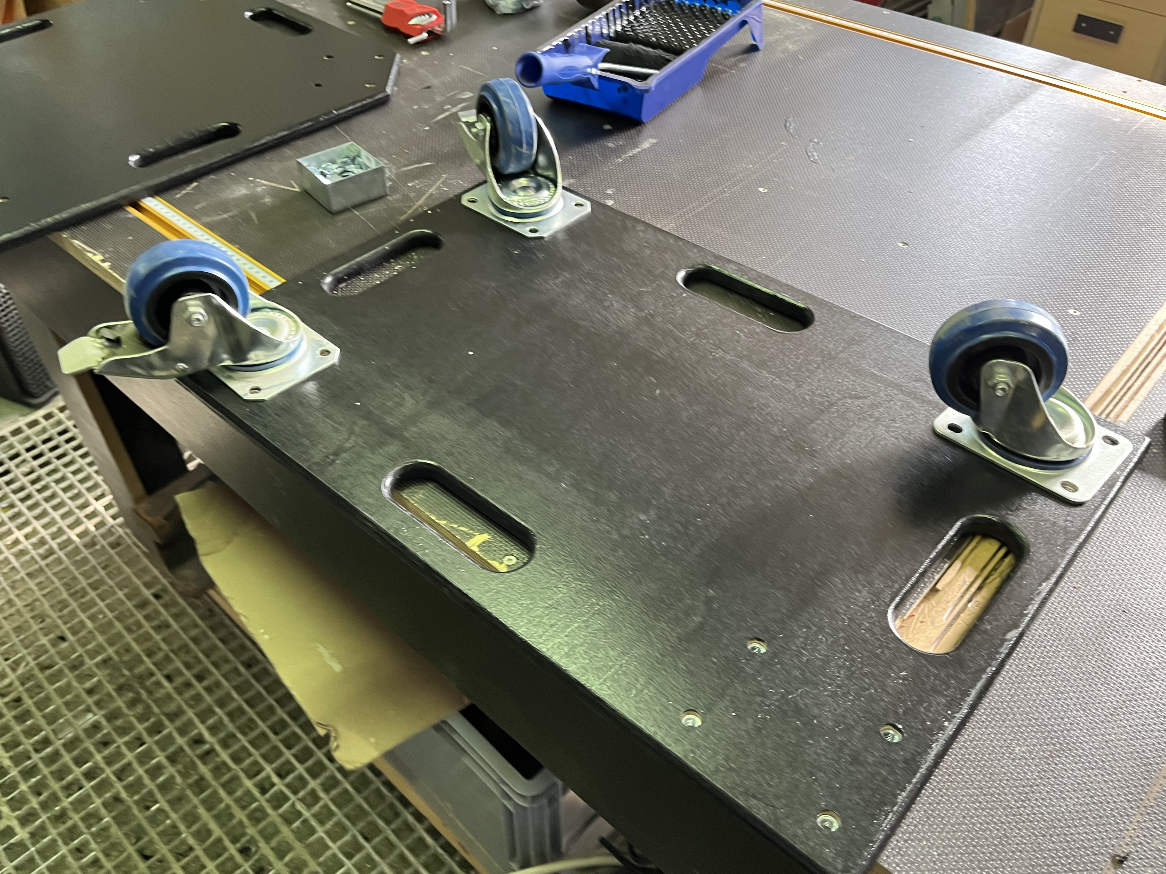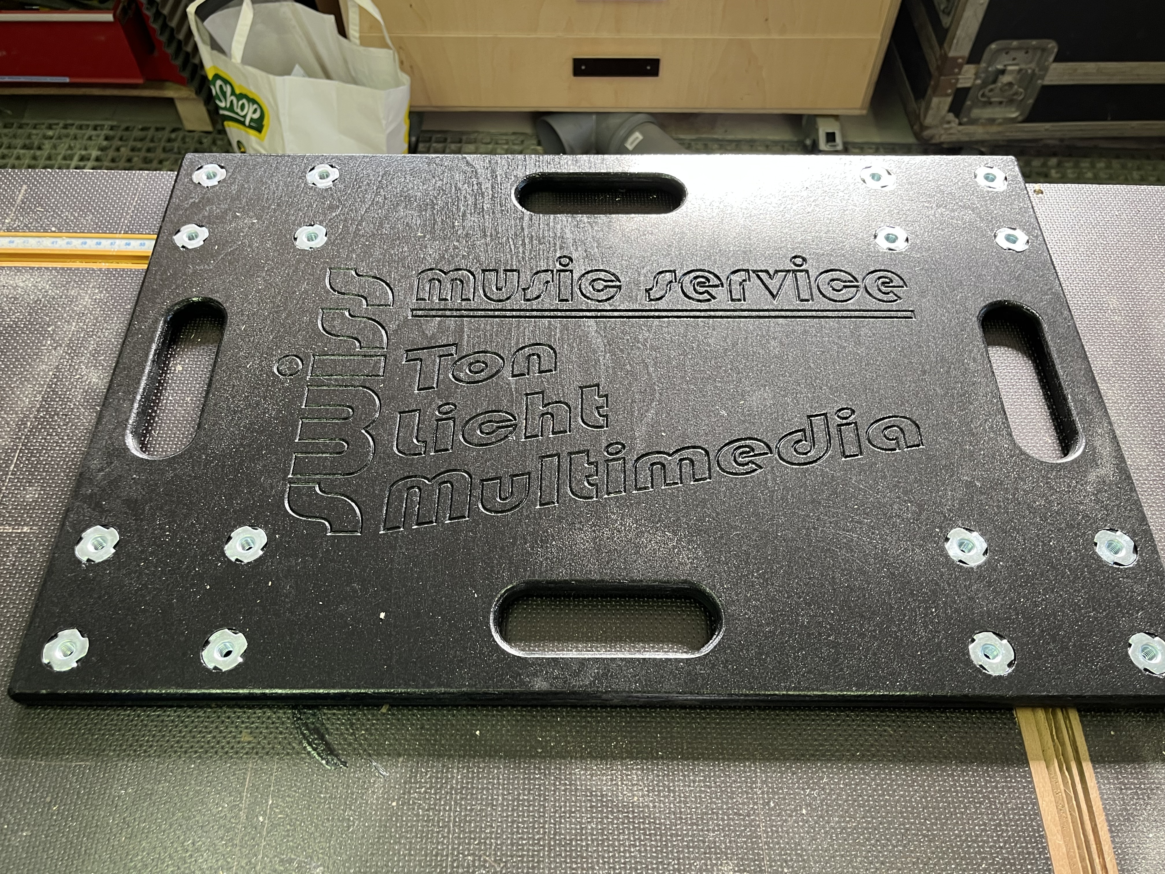 neue Rollenbretter mit den Massen 400 x 600mm und eingefrästem Logo und einem Rollenbrett mit passenden Stapelfräsungen für Cases.